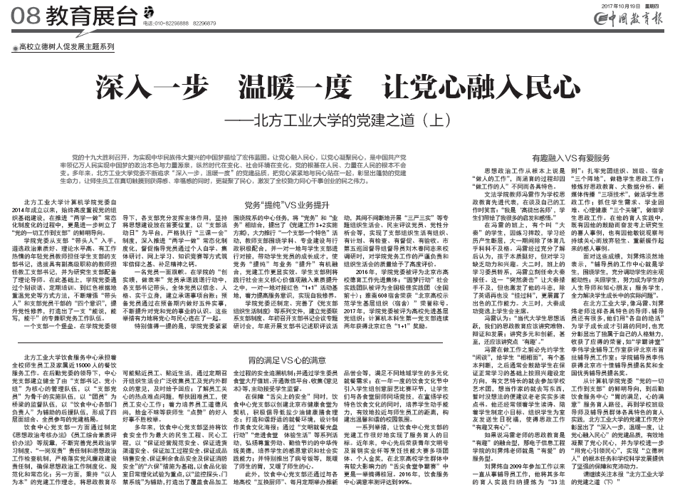 从计算机学院党委“党的一切工作到支部”的鲜明导向,到后勤饮食服务中心“胃的满足,心的满意”服务育人路径,再到学校班级导师及辅导员群体各具特色的育人实践,北方工业大学的党建工作充分彰显出了“深入一步,温暖一度,让党心融入民心”的党建品质,有效地凝聚了党心民心,并为学校进一步“用党心引领民心”,实现“立德树人”的根本任务和学校科学发展提供了坚强的保障和充沛动力。