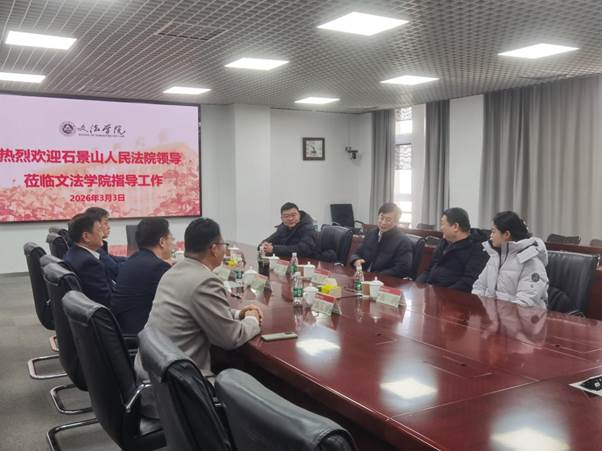 刘泽军对石景山区法院为张延祥教授挂职提供的支持表示感谢,并表示希望这种合作能够长期化;结合校庆80周年和学院十五五规划建设,重点介绍了我院在学科建设、人才培养、科学研究及社会服务等方面的核心优势与发展成果;并就进一步加强校地合作,推动资源共享、优势互补、协同发展,持续构建法治人才培养共同体建设进行交流。