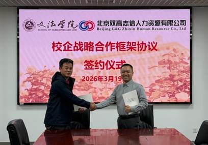 签约仪式上,校企双方围绕合作背景、资源优势、发展规划及人才培养与就业需求等方面展开深度沟通。邝洪波副书记介绍了学院人才培养特色与就业工作开展情况,他表示,学院始终将人才培养与就业服务作为工作双主线,此次战略合作是对去年双方“产教融合促就业”专场招聘活动的深化与升级,校企将以资源共享、优势互补为原则,构建“人才共育、过程共管、就业共促”的长效合作机制,为学生成长成才与职业发展搭建更广阔的实践平台。孙文总监代表企业介绍了公司发展布局、业务领域及核心人才需求导向,他强调,企业将全力支持校企合作各项工作落地,依托行业资源与实践平台,助力学院培养适应市场需求的高素质应用型人才,实现校企发展与人才培养的同频共振。随后,双方代表正式签署校企战略合作框架协议,标志着文法学院与北京双高志兴人力资源有限公司的校企共建合作迈入新阶段。