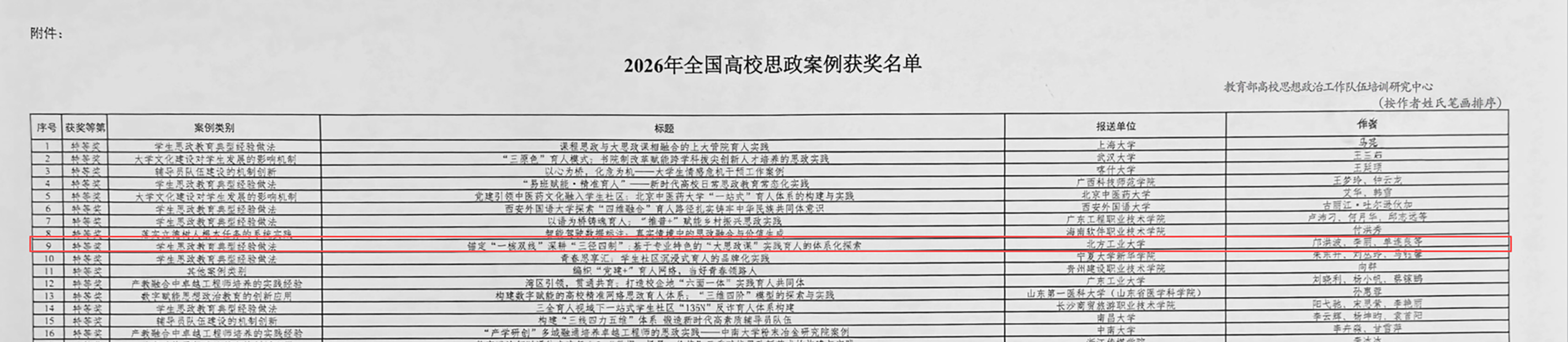近日,2026年度全国高校学生思想政治工作优秀案例征集评选结果正式揭晓。我院申报的《锚定“一核双线”深耕“三径四制”:基于专业特色的“大思政课”实践育人体系化探索》案例,从全国2485个参评项目中脱颖而出,成功获评特等奖(全国仅50项)。这一殊荣充分彰显了学校在“大思政课”建设与实践育人改革中的创新成效,标志着我校在新时代“大思政课”建设与实践育人创新领域的探索成果,获得全国高校思政工作领域的高度认可。