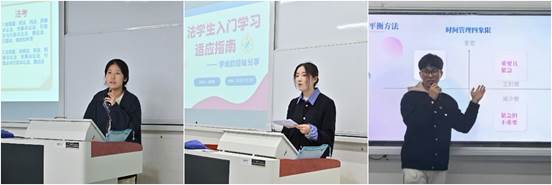 法学22-1班时红杰从书本学习方法、课外实践安排两方面分享了自己学习的经验;知产22班王田慧从学习习惯、生活适应、心态建设三方面分享了法学学生如何及时调整适应二年级的学习节奏;英语22-2班张煜从课外实践、专业学习、习惯养成三方面与现场学生进行了深入交流。三位同学的发言内容详实,重点突出,实操性强,进一步帮助2024级学生厘清了今后的努力方向以及提供了走向成功的可靠路径;他们的发言引起了到会同学的共鸣并获得了一致好评。